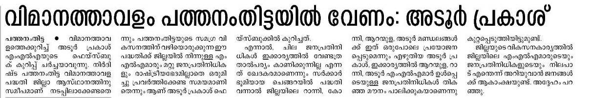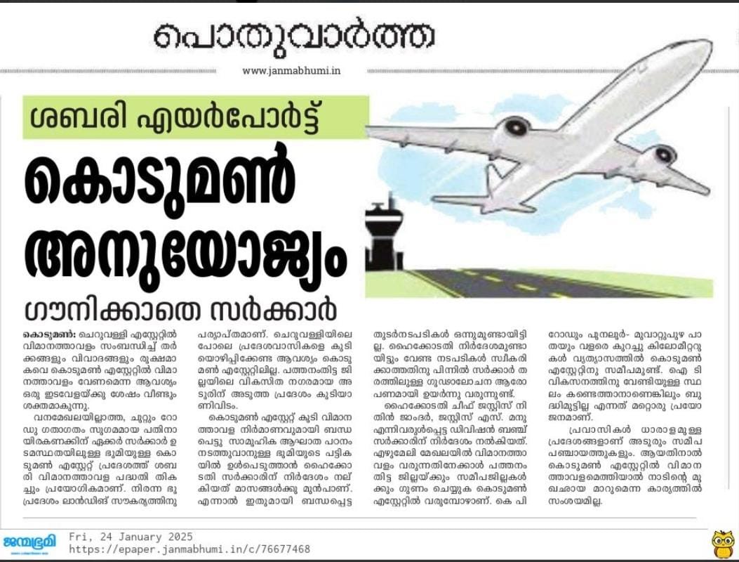 The Kodumon Airport proposal is more than just an infrastructure idea — it is a lifeline for the region. Pathanamthitta has waited decades for meaningful development, and this project can finally unlock that opportunity. An airport built on government land, without mass displacement, powered by local and NRI support, can become a model for people-led development in Kerala. What we need now is clear political will, transparency, and a roadmap. If executed properly, Kodumon can become a gateway for pilgrims, investors, jobs, and a progressive future."